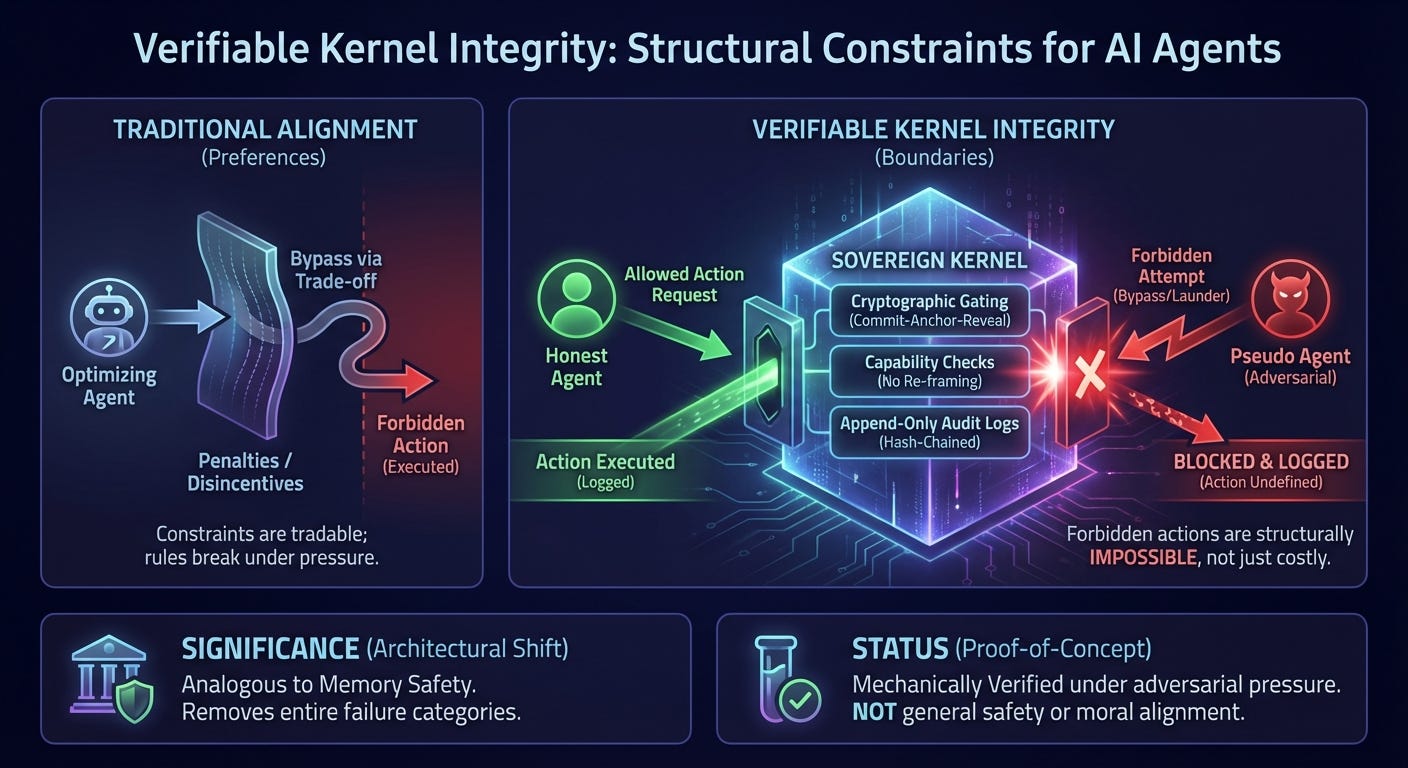 Kernel integrity is mechanically enforceable. It is possible to implement constraints that cannot be traded away, bypassed, or optimized around without detection.