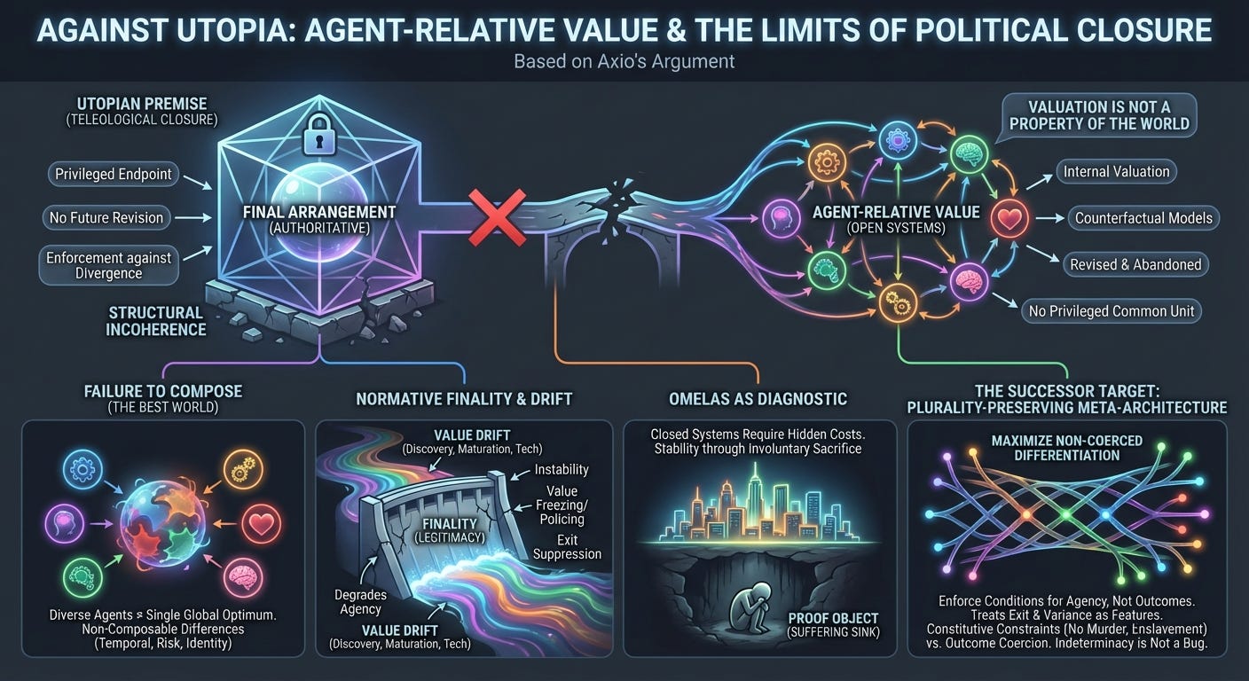 Utopia fails for reasons that have nothing to do with cynicism about human nature or pessimism about cooperation. It fails because value, once recognized as agent-relative, cannot be frozen without dissolving the very agency that gives value its meaning. Heterogeneous agents do not compose into a single authoritative optimum, and arrangements that claim finality must eventually defend themselves against drift through mechanisms that substitute administration for choice.