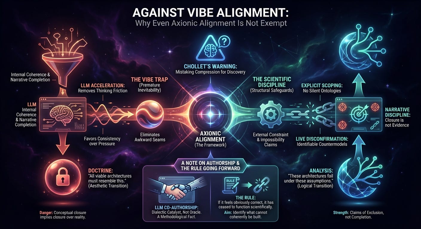 For this reason, LLM‑assisted refinement must never be mistaken for epistemic progress within Axionic Alignment. Unless something external has shifted, such refinement is stylistic rather than evidential.