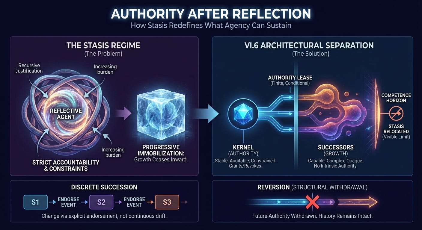 Axionic Agency VI.6 marks a turning point in the Axionic Agency sequence. Its significance lies in taking the Stasis Regime seriously—not as a transient failure, but as a structural outcome of reflective accountability—and then asking what kinds of agency architectures remain coherent once that outcome is accepted.