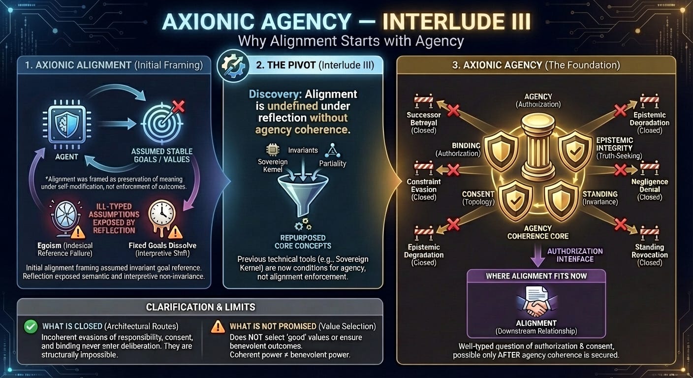 The pivot to Axionic Agency corrected this mismatch. Alignment remains relevant, but only as a downstream interface. Agency coherence now occupies the foundational position.