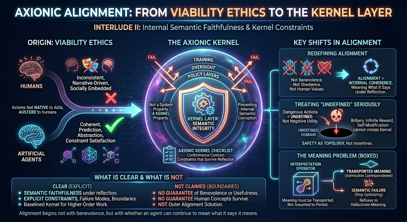 That focus produced the Axionic Kernel Checklist: not a manifesto, but a conformance contract. A system either satisfies the kernel constraints or it does not. Performance and intent are irrelevant.