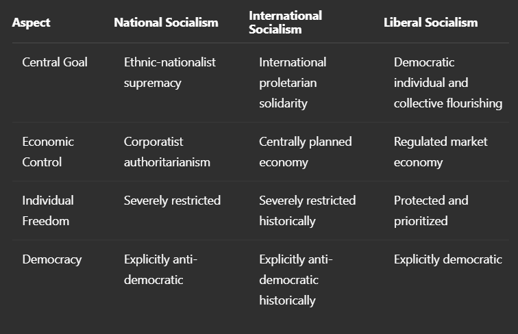 National and International Socialisms, despite ideological rivalry, share crucial characteristics: authoritarian governance, suppression of individual rights, and state control at the expense of personal freedoms. In contrast, Liberal Socialism explicitly prioritizes individual rights and democratic processes, employing socialist-inspired policies pragmatically rather than dogmatically.