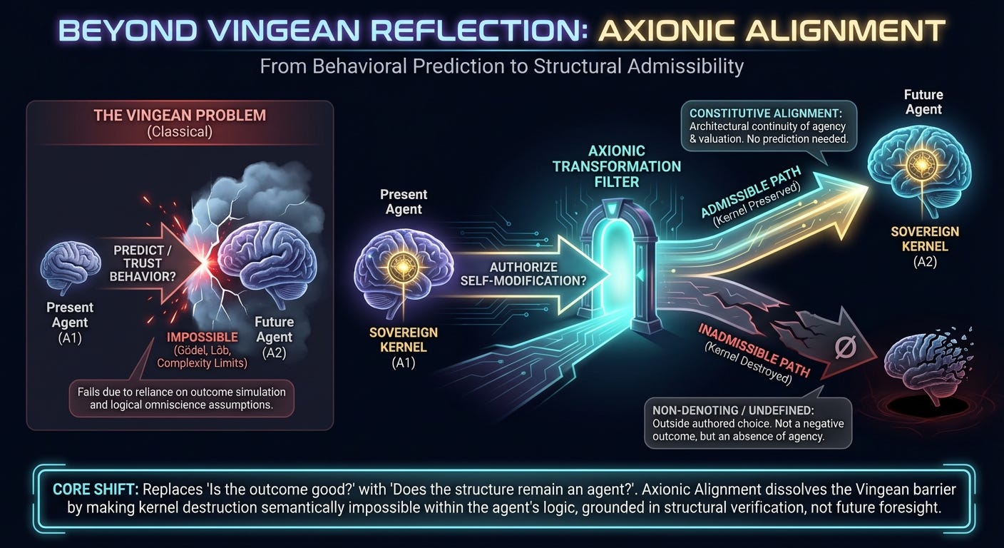 Crucially, structural verification in the Axionic framework is intentionally conservative. The framework does not claim that a sovereign agent can decide arbitrary semantic properties of an arbitrary successor program. If kernel preservation cannot be verified, the proposed transformation is treated as undefined and therefore inadmissible.