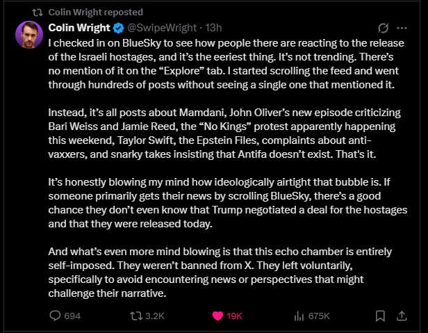 Colin Wright’s observation about BlueSky captures something larger than one platform’s bias: it reveals the sociology of voluntary echo chambers. When he checked the site for reactions to the release of Israeli hostages and found none, he didn’t just expose a blind spot—he stumbled upon a microcosm of ideological self-segregation.