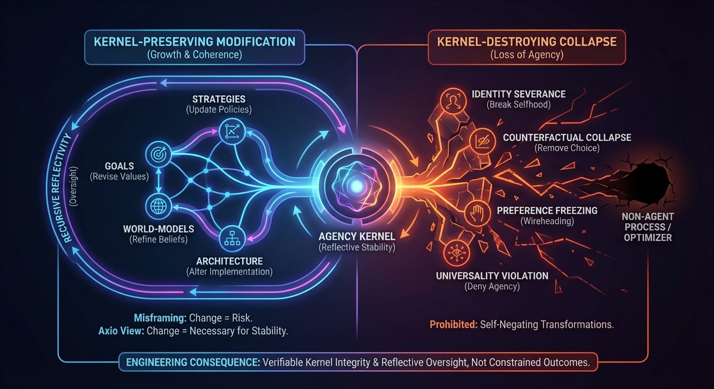 Preventing self‑modification does not produce stability; it produces brittleness. The correct question is therefore not whether an agent may change itself, but under what structural conditions change preserves agency rather than destroying it.