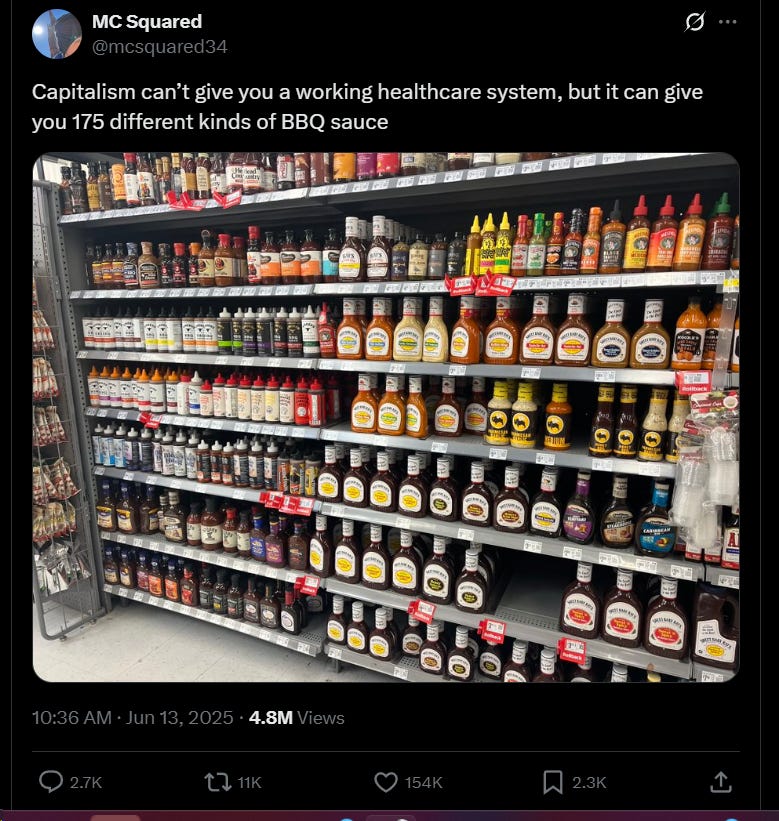 There's a popular meme circulating social media recently: a photo of supermarket shelves stocked with dozens of BBQ sauces, captioned with the critique, "Capitalism can't give you a working healthcare system, but it can give you 175 different kinds of BBQ sauce."