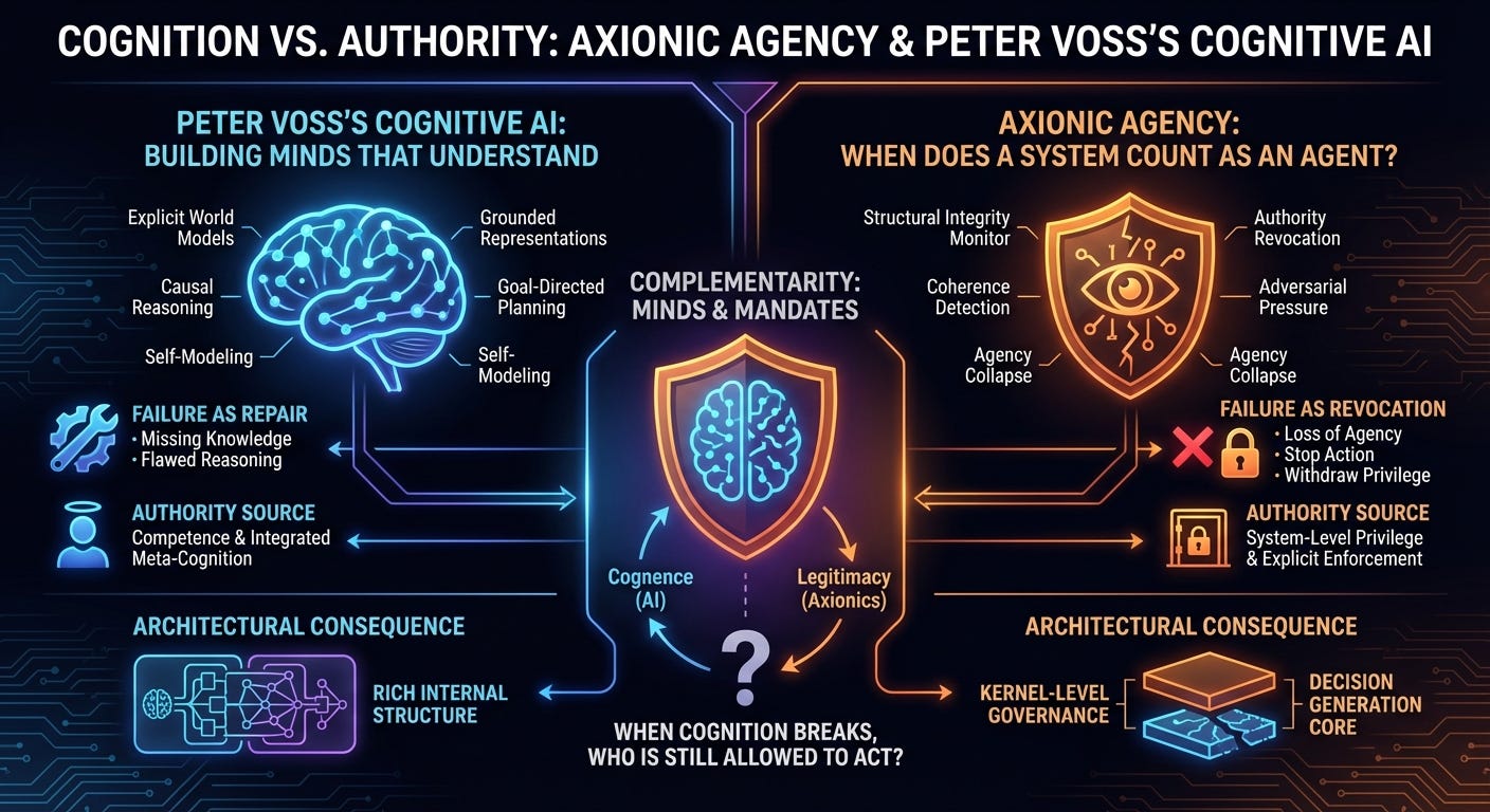 A synthesis is natural. Cognitive AI supplies competence. Axionic governance supplies legitimacy and containment.