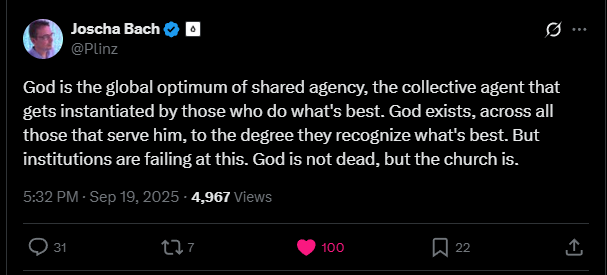 Bach’s definition is elegant but incomplete. It succeeds in reinterpreting God as an emergent attractor of agency but glosses over the hard problem: how we discover, justify, and coordinate around “what’s best.” Without rigorous value-discovery mechanisms, this God risks becoming a rhetorical flourish for personal conviction. Institutions may have failed, but they failed at precisely the task Bach’s God requires—resolving pluralism into coordinated agency.
