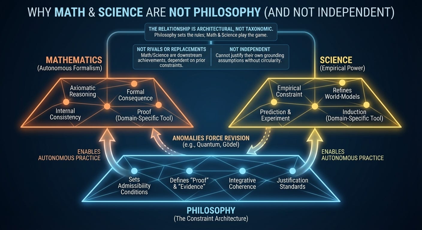 Philosophy operates at the level of constraint. It fixes the background conditions under which inquiry is intelligible: what counts as explanation, justification, error, and success. Once those constraints are in place, mathematics and science become possible as autonomous practices.