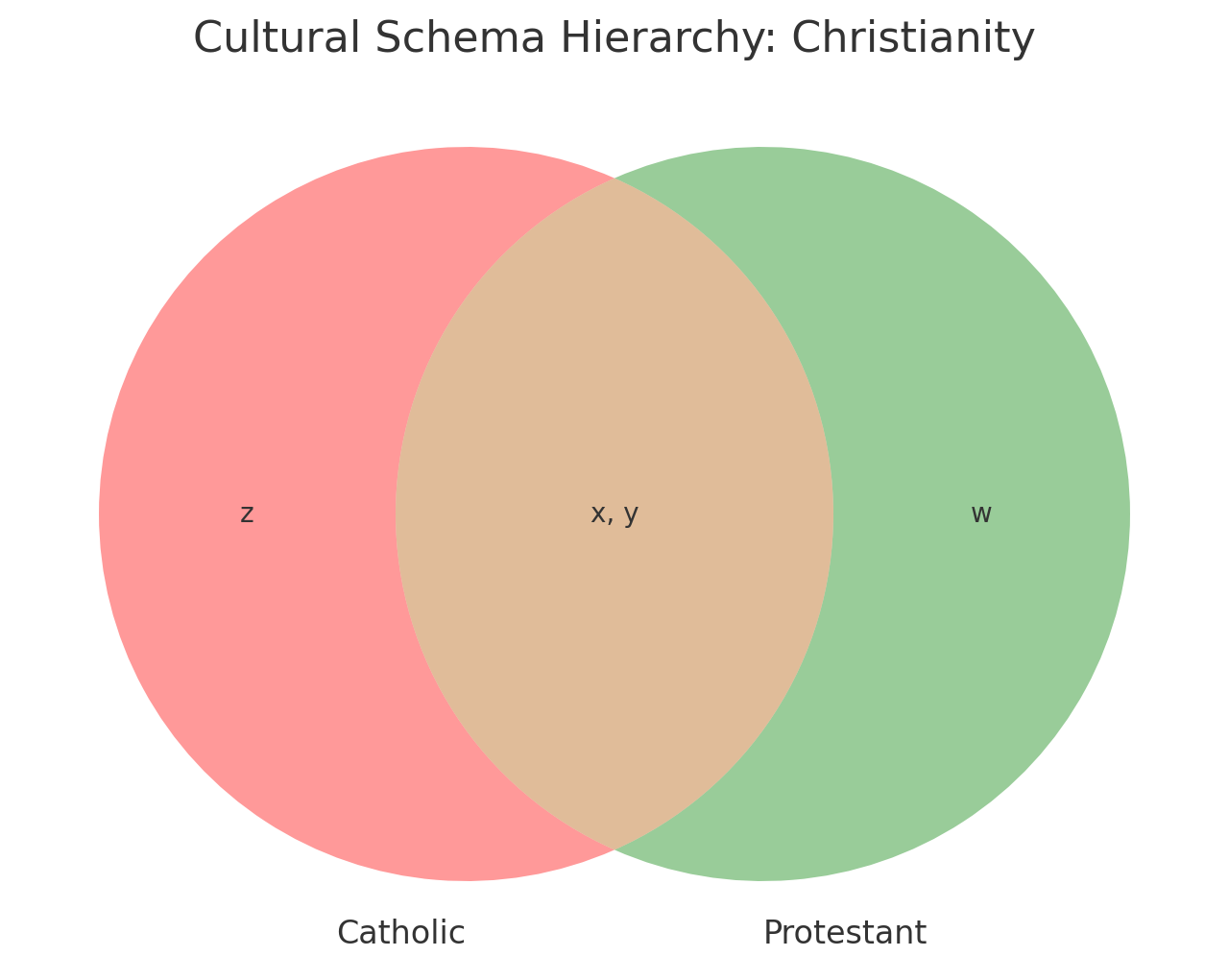 Both schemas share beliefs {x,y}. These common beliefs (the intersection of the sets) define a broader schema, the Christian schema: