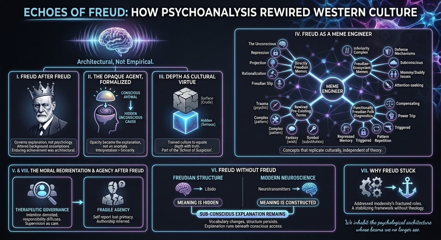 Sigmund Freud survives less as a theorist than as an unacknowledged legislator of common sense. Western culture continues to inhabit the conceptual space he carved, even while insisting it has moved beyond him.