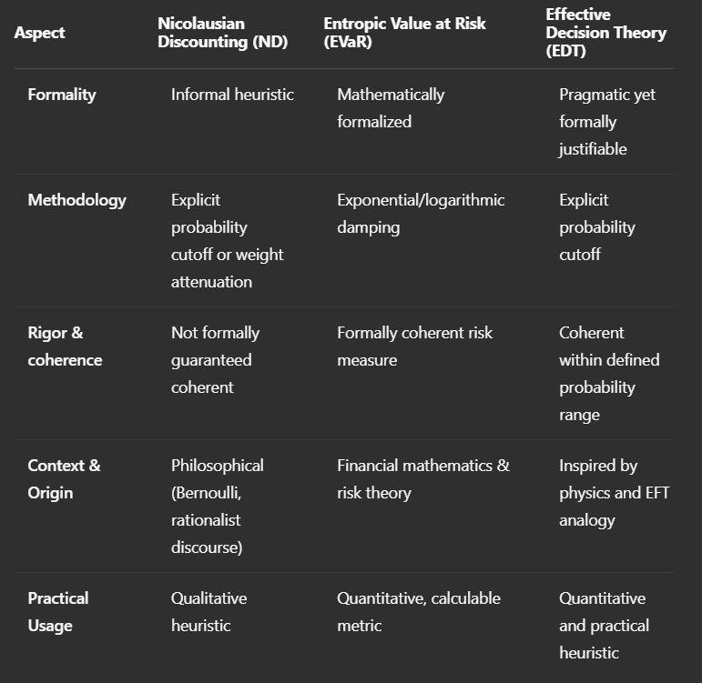 Entropic Value at Risk (EVaR): A coherent quantitative measure that can complement EDT by assessing risk within EDT's effective probability range.[5]