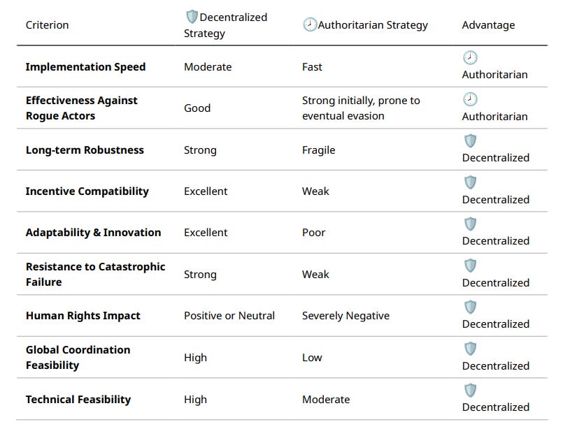 In striving to secure humanity against existential AI threats, the authoritarian strategy might promise quick wins but ultimately poses serious long-term risks and moral hazards. A decentralized, voluntary approach, by contrast, aligns more robustly with human flourishing, individual autonomy, and ethical governance.