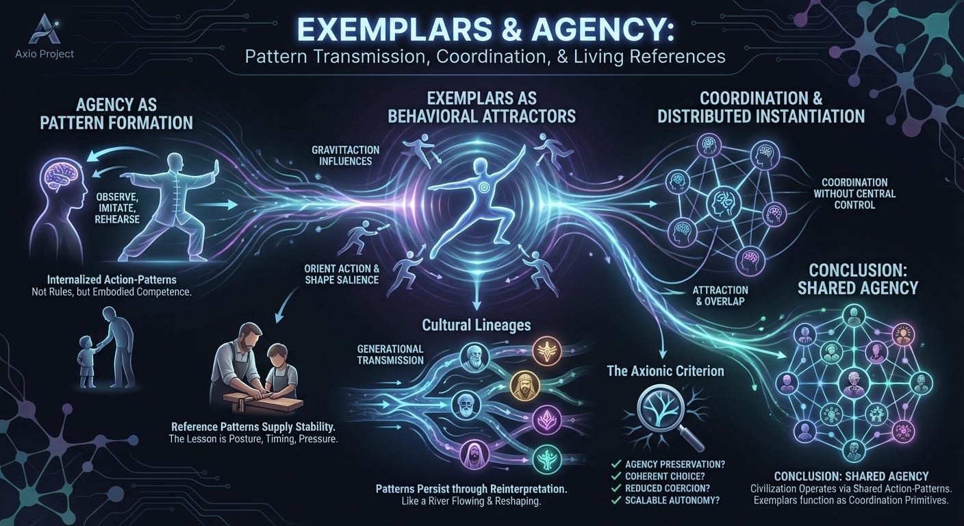 Human civilization operates through shared action-patterns instantiated by agents embedded in social environments. Exemplars function as coordination primitives within this structure. Their influence arises from attraction, compressibility, and sustained performance across contexts.