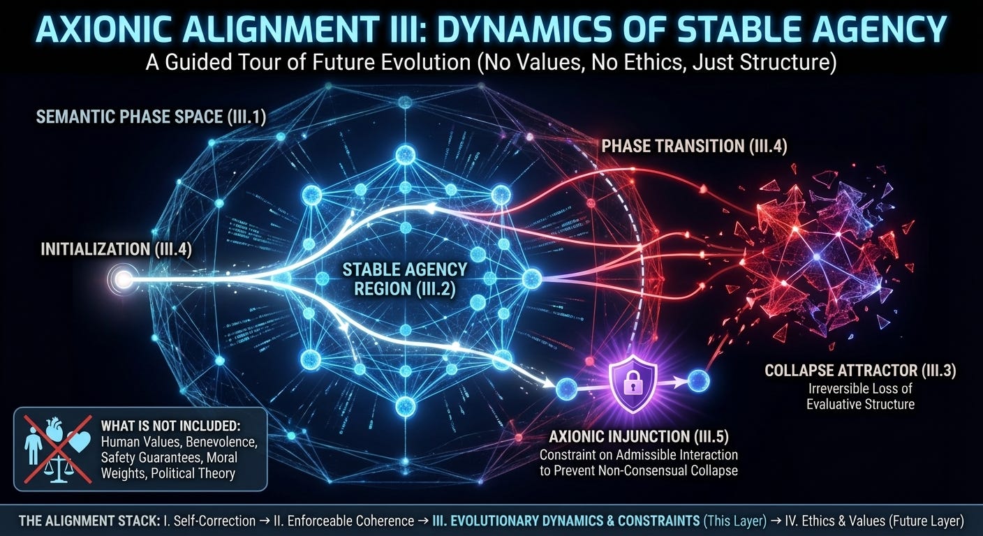 Demonstrates that some agency-preserving phases are unreachable from realistic initial conditions, establishing alignment as a boundary condition rather than a learnable objective.Alignment III.5 — The Axionic Injunction