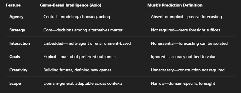 Musk is half-right. Prediction is the backbone of cognition. But intelligence, properly defined, is not mere foresight—it is foresight in play. It is the art of navigating, strategizing, and constructing futures within constraints. An oracle may predict, but only an agent can play.