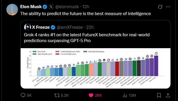 Elon Musk recently declared: “The ability to predict the future is the best measure of intelligence.” The claim is crisp, provocative, and—as usual with Musk—self-serving. It plays neatly into the marketing of Grok 4, which he claims has outperformed GPT‑5 Pro on the new FutureX benchmark for real-world predictions. But is Musk right? Is foresight the definitive litmus test of intelligence?