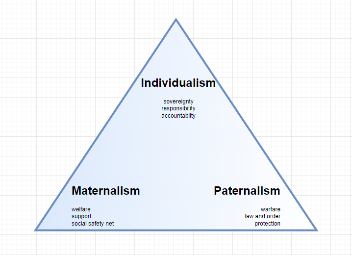 Modern liberal democracies typically position themselves near the center of a political triangle defined by Individualism, Maternalism, and Paternalism. This pragmatic equilibrium seeks to balance competing demands: