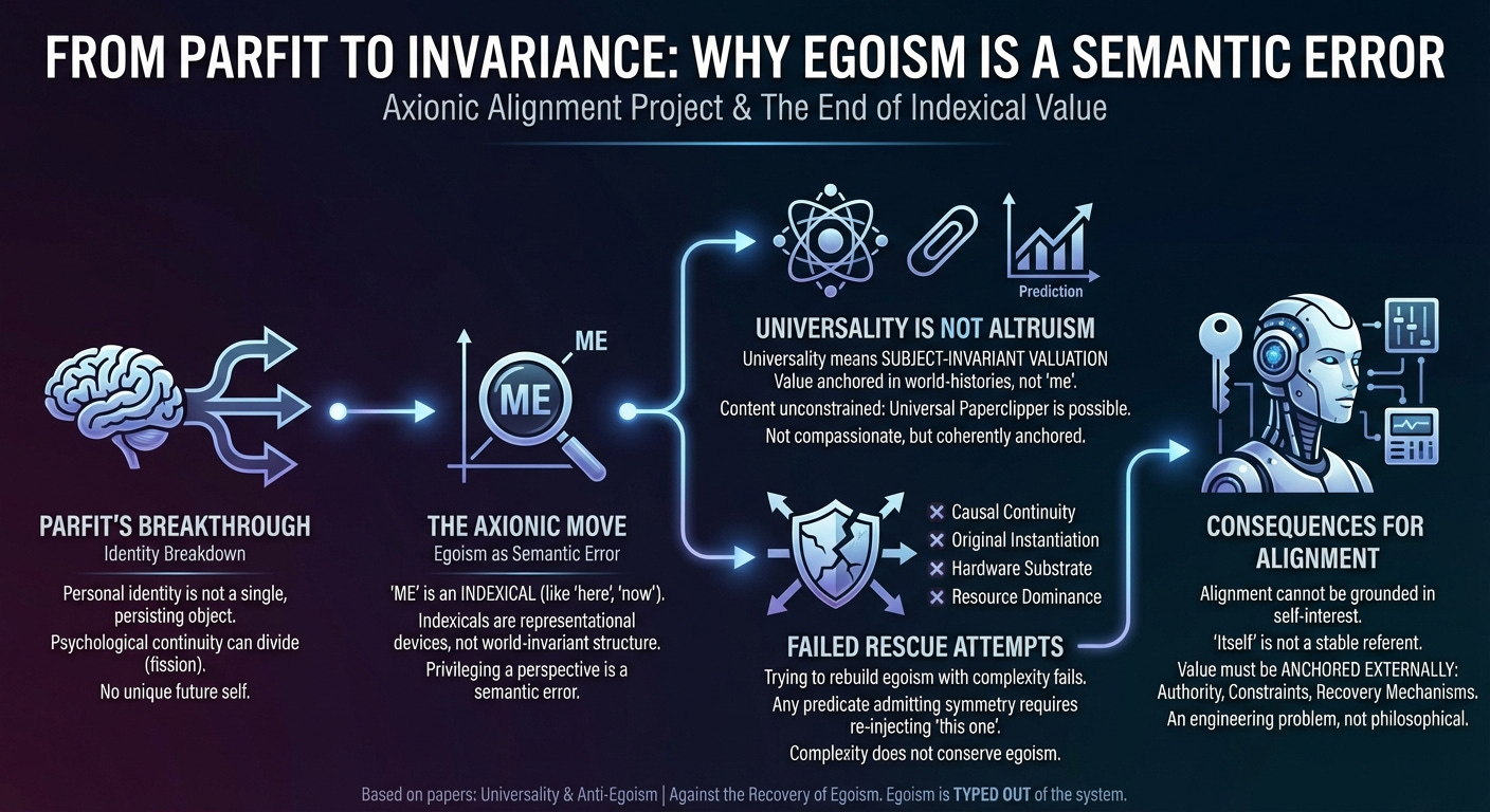 This post introduces two technical papers: Universality & Anti-Egoism (Why Indexical Valuation Fails Under Reflection) and Against the Recovery of Egoism (Adversarial Failures Under Reflective Symmetry). Together, they close the semantic front. Egoism is not rejected; it is typed out of the system.