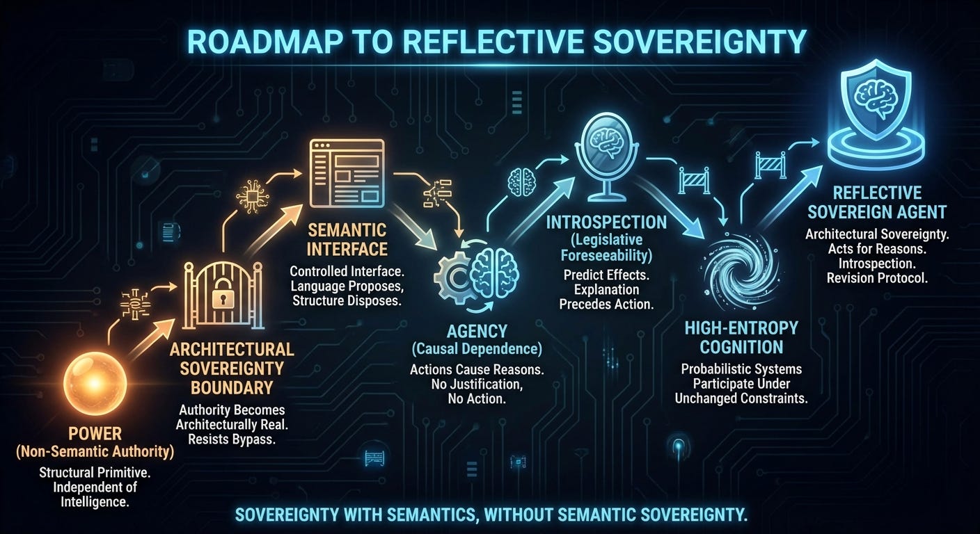 This roadmap takes that question as primary. It begins with power rather than cognition, moves carefully toward agency, then toward introspection, and only at the end allows high-entropy reasoning systems anywhere near sovereignty. The destination is a Reflective Sovereign Agent. The path to reach it is intentionally narrow.