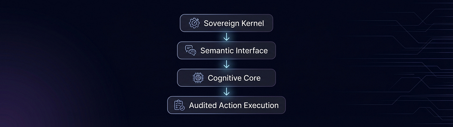 In most systems, language implicitly interprets rules. This roadmap introduces a different arrangement. Semantic cognition interacts with authority only through a deliberately constrained Semantic Interface, a typed boundary that requires meaning to be expressed in a form enforcement mechanisms can process mechanically.
