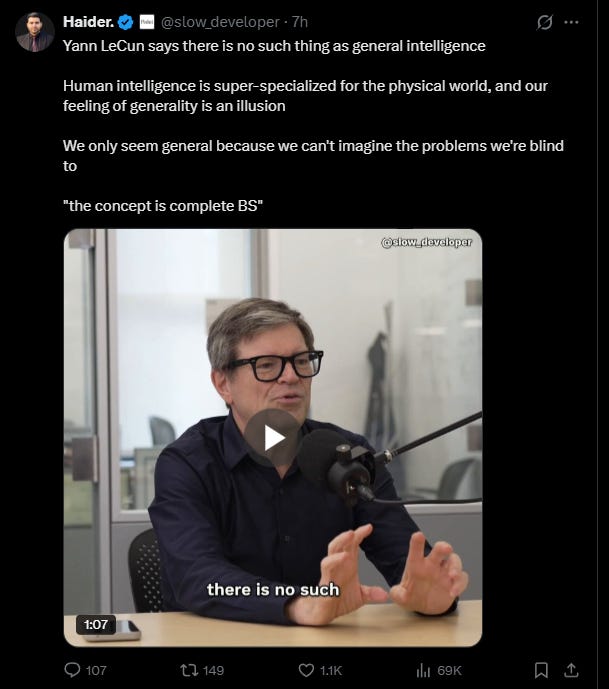 Yann LeCun has argued that general intelligence is an illusion: humans appear general only because we cannot imagine the problems to which we are blind. Human cognition, on this view, is merely a bundle of highly specialized competencies optimized for a narrow ecological niche. The implication is that “general intelligence” names no real property, only anthropomorphic overreach.
