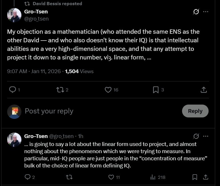 A recent exchange framed IQ as a scalar projection from a high-dimensional cognitive space, emphasizing that such projections are inherently lossy and sensitive to the choice of linear form. The implication was that mid-range IQ scores largely reflect geometric concentration rather than substantive differences in intelligence, and that the measure itself therefore carries limited explanatory weight.