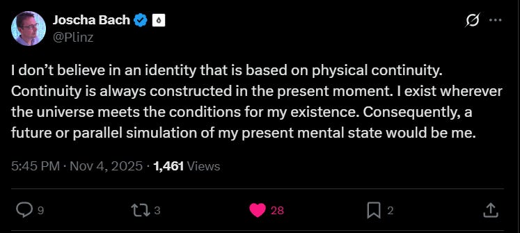 Joscha Bach recently wrote: “I don’t believe in an identity that is based on physical continuity. Continuity is always constructed in the present moment. I exist wherever the universe meets the conditions for my existence. Consequently, a future or parallel simulation of my present mental state would be me.”