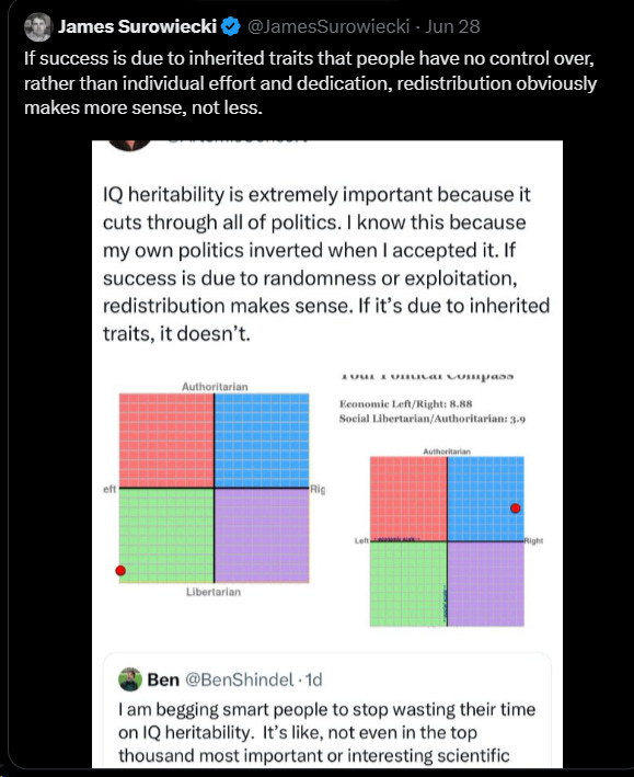 A recent social media debate highlights a common misunderstanding regarding redistribution and coercion. James Surowiecki argues that if success results primarily from inherited traits—something individuals have no control over—then redistributive policies become more justified. The assumption here is that unearned success morally obligates redistribution.