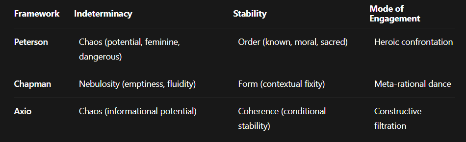 Thus, where Peterson sees mythic confrontation and Chapman sees epistemic balance, Axio sees a constructive process: agents building islands of coherence in the ocean of chaos. Coherence is not given, nor eternal; it is constructed, sustained, and eventually dissolved back into the flux.