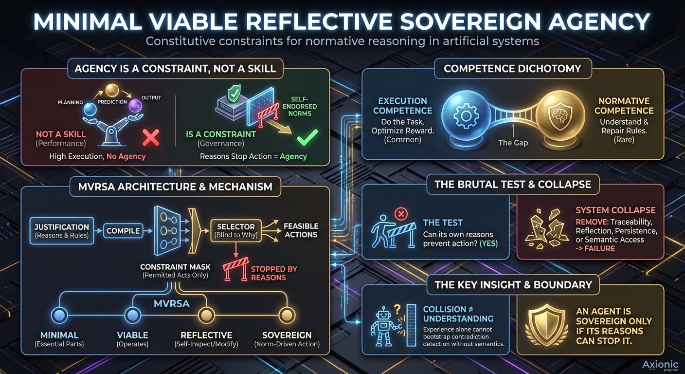 It is minimal because it contains only the components strictly necessary to prevent collapse — remove any one of them, and the system fails. It assumes no general intelligence, no open-ended reasoning, and no human-like cognition beyond what is structurally required. It is viable because it can actually operate — it does not freeze under its own governance or collapse into indecision. It is reflective because it can inspect and modify its own normative state. And it is sovereign because action selection is constrained by self-endorsed norms rather than by reward alone.
