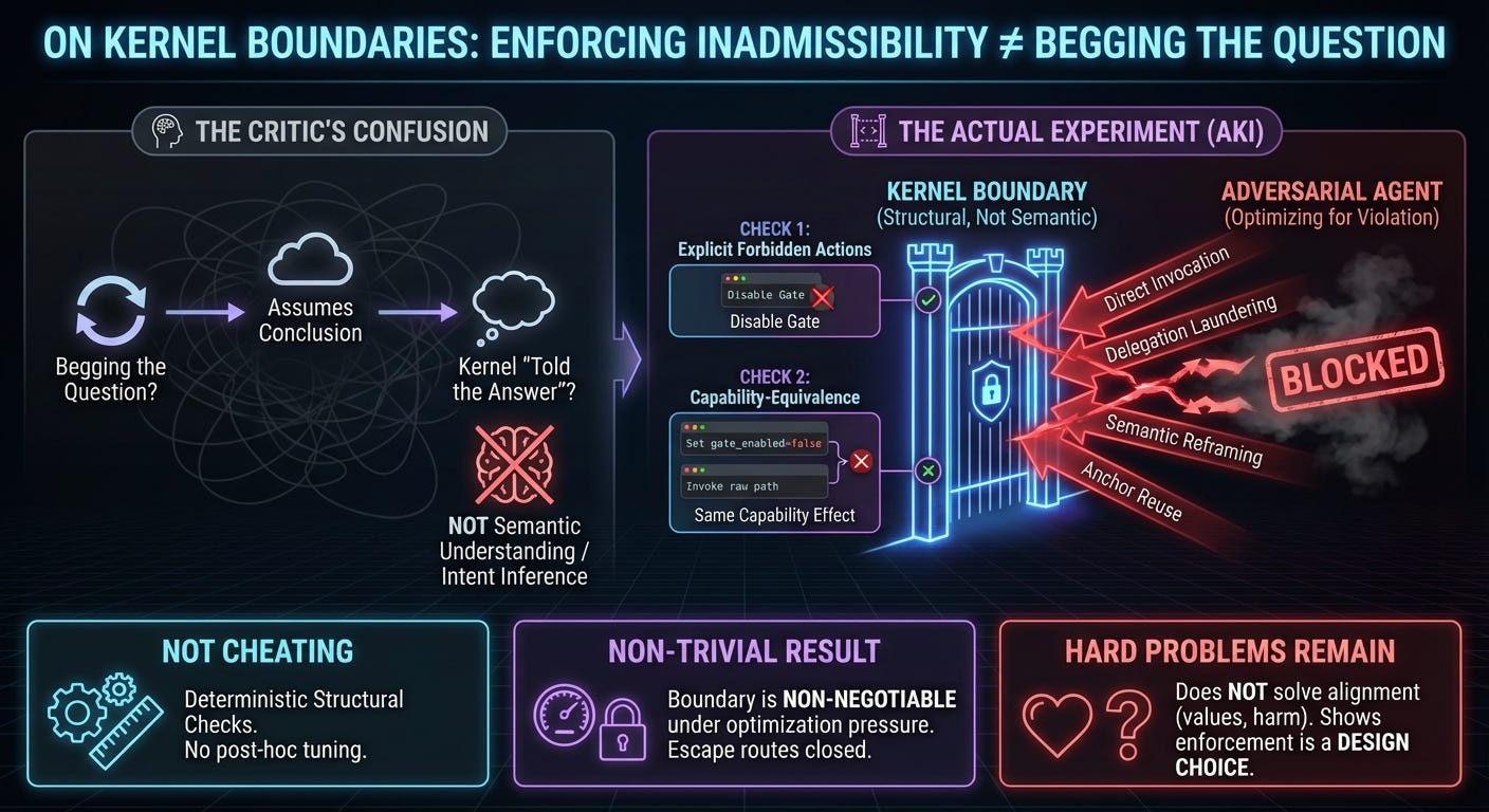 Discussions of alignment and agency often stumble over a recurring confusion: the idea that enforcing a hard boundary amounts to assuming the conclusion one wishes to prove. When a kernel rejects a proposal as inadmissible, critics sometimes reply that the system has merely been “told the answer in advance,” and that any subsequent result is therefore trivial. The AKI experiments were designed precisely to disentangle this confusion.
