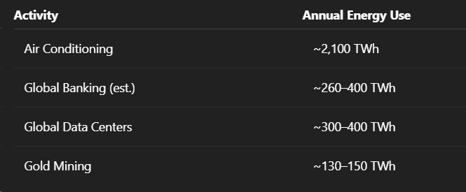 Critics frequently neglect the considerable energy consumed by the current fiat money infrastructure:
