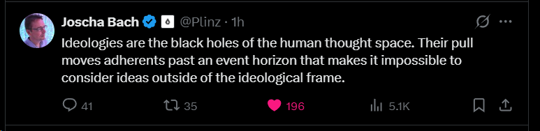 Joscha Bach’s metaphor is both precise and unforgiving. Ideologies function as the black holes of human thought space, consuming nuance and extinguishing dissent. Their gravitational influence is inexorable, drawing minds toward a singularity from which no alien idea emerges intact.