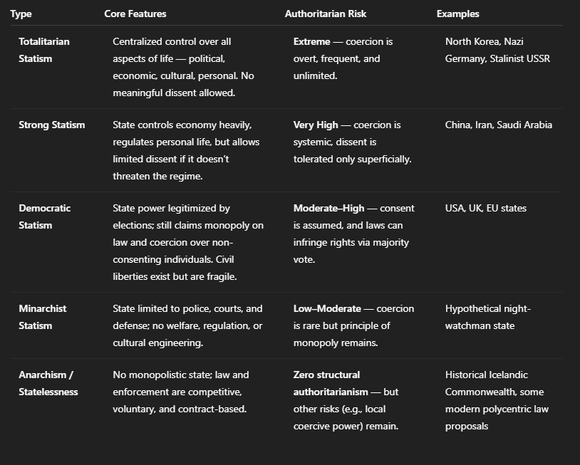 Whether it’s gentle authoritarianism (traffic laws enforced on non-consenting pacifists) or brutal authoritarianism (secret police breaking into homes), the mechanism is the same — the state asserts the right to coerce beyond voluntary agreement.