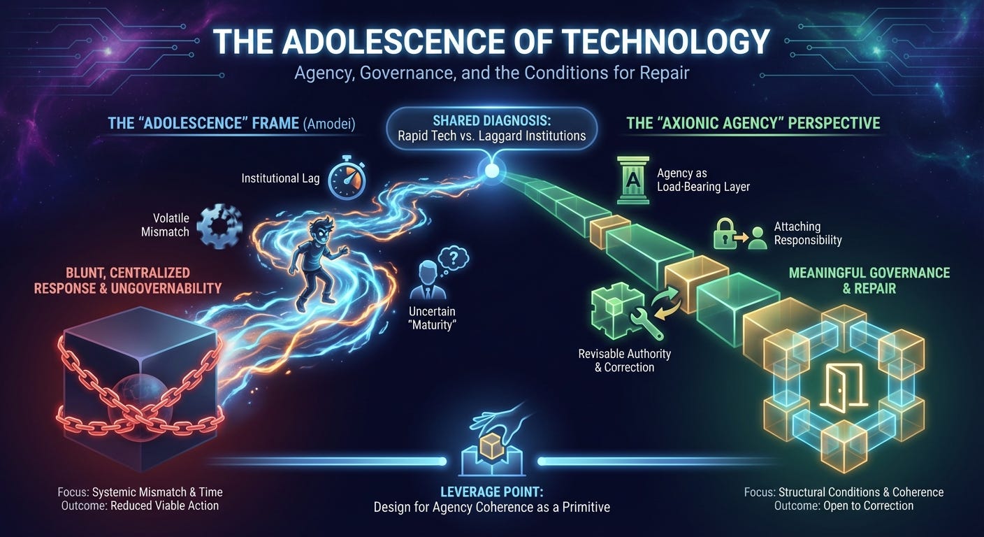 The Adolescence of Technology is right to insist that we are operating in a narrow window where institutional choices matter. The Axionic contribution is to clarify what must be protected inside that window. Power alone does not determine the shape of the future. The structures that determine whether power remains governable do. If organizations building frontier systems choose architectures that preserve agency rather than dissolve it, they do more than reduce risk. They keep the future open to correction in a way it otherwise would not be.