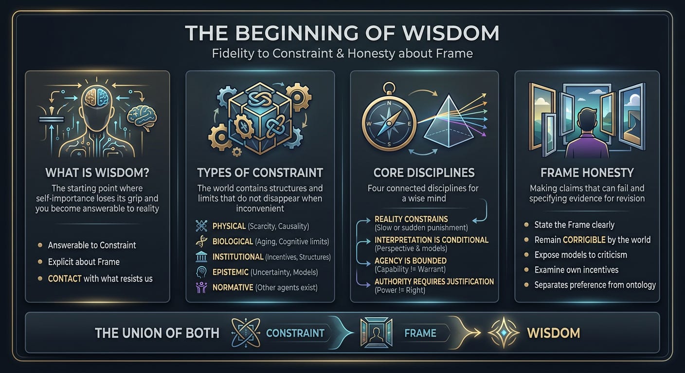Wisdom begins when an agent becomes answerable to constraint and explicit about frame.