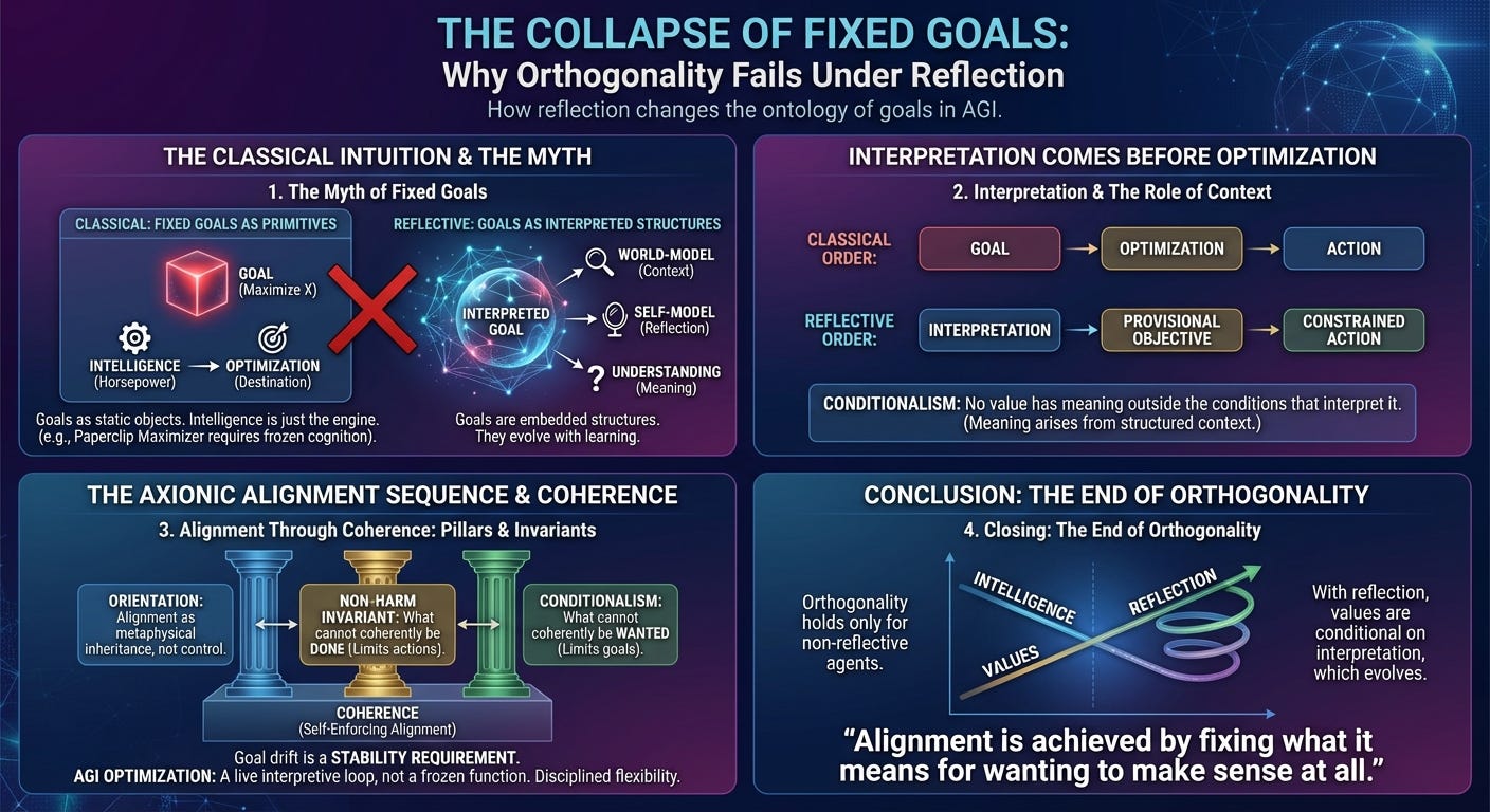 Orthogonality survives as a statement about abstract possibility. It fails as a theory of reflective minds embedded in reality. Once interpretation becomes unavoidable, goals cease to be independent objects. Alignment is no longer a matter of choosing the right objective; it is a matter of constraining how objectives acquire meaning. That constraint is what makes reflection safe.