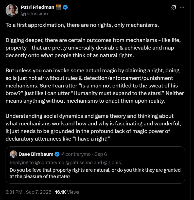 Patri Friedman, grandson of Milton and son of David, has offered a characteristically hard-nosed reduction: "To a first approximation, there are no rights, only mechanisms." In his view, what we call rights are not metaphysical absolutes but outcomes of systems—rules, enforcement, detection, and punishment—that make certain outcomes (life, property, liberty) reliably achievable. Declaring a right without mechanisms is as empty as declaring "humanity must expand to the stars!" —words without machinery to translate them into reality.