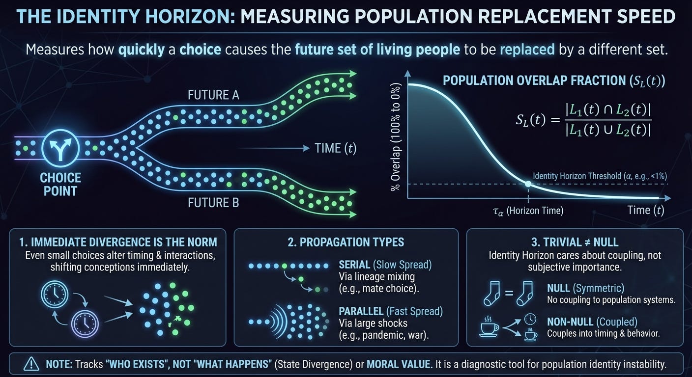 The Identity Horizon does not measure moral importance, responsibility, harm, benefit, or value. It measures one thing only: how quickly a choice causes the future set of living people to be replaced by a different set of living people.