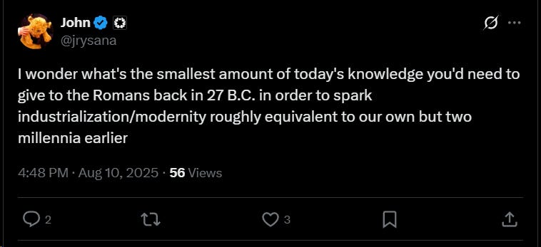 Given the right leaders, Rome could plausibly progress from water wheels to locomotives and telegraphs in under two centuries, rewriting the trajectory of civilization.