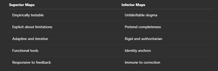 Effective maps are pragmatic instruments—evaluated by predictive success and practical utility, not emotional comfort or ideological allegiance.