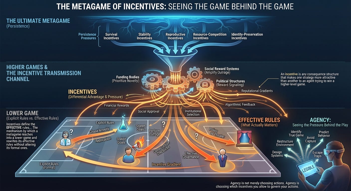 Incentives are the mechanism by which a metagame reaches into a lower game and rewrites its effective rules without altering its formal ones.