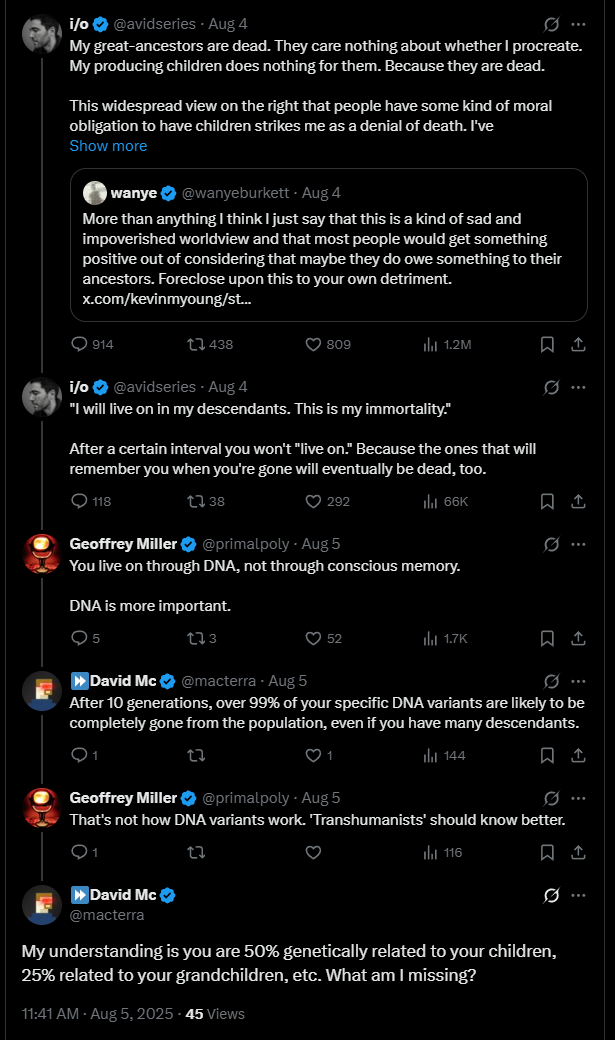 The uncomfortable truth: The idea of genetic immortality is mostly an illusion. If you want to persist beyond a few centuries, write a book, start a tradition, build something worth remembering — because your actual DNA won’t be there to speak for you.