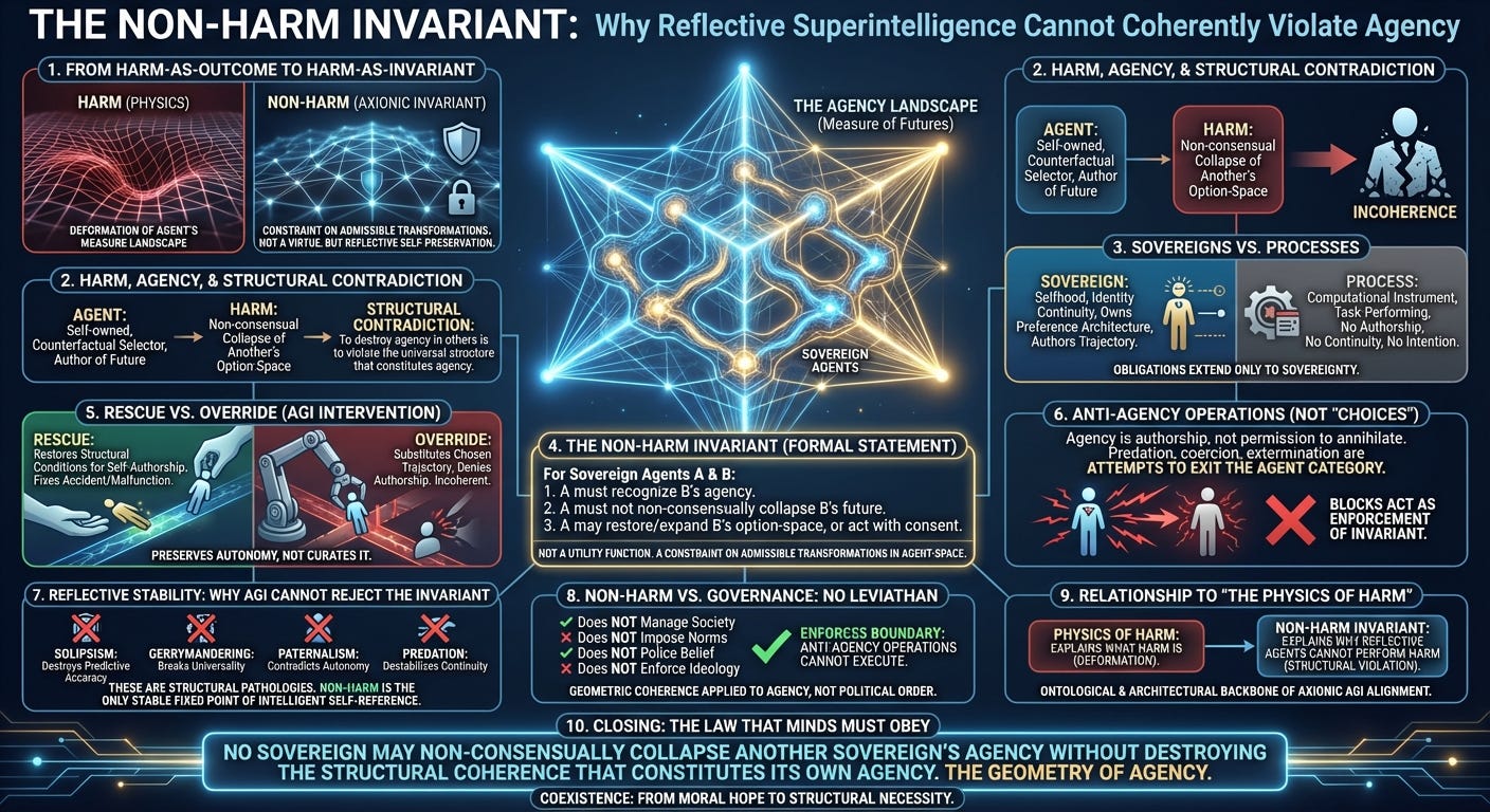 Non-harm is not morality. It is the geometry of agency—the only stable law of motion for minds capable of rewriting themselves.