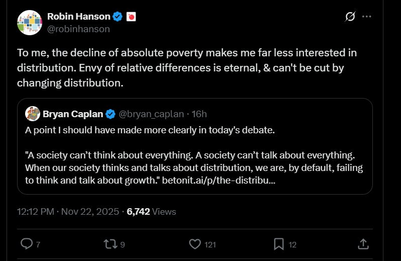 The debate between Robin Hanson and Bryan Caplan over distribution versus growth exposes a deeper confusion in modern political morality: the conflation of relative position with actual harm. This mistake is everywhere. It animates resentment politics, justifies destructive redistribution, and reframes status anxiety as a public good. Yet the underlying phenomenon is simply envy—a primate comparator loop mistakenly elevated into a moral principle.