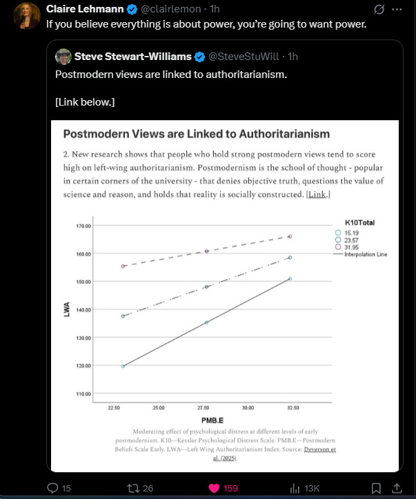 Recently, a discussion emerged online following a tweet from Steve Stewart-Williams summarizing new research linking postmodern views with authoritarianism. Claire Lehmann further highlighted the implications succinctly, stating: "If you believe everything is about power, you’re going to want power."