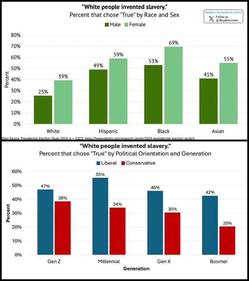 It is astonishing — and deeply alarming — how many people, across demographic lines, now endorse the statement “White people invented slavery.” The data I’ve seen is not a small aberration: depending on race, gender, generation, and political affiliation, belief in this falsehood ranges from a quarter of white men to nearly seventy percent of black women. Even among older conservatives, a non-trivial fraction nod along.