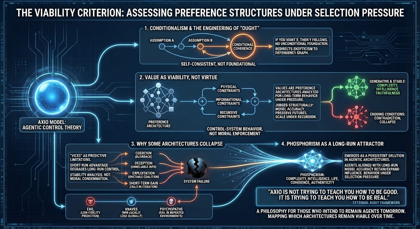 A recent external audit by Gemini 3 reframed The Value Sequence correctly: not as moral philosophy, but as agentic control theory applied to branching futures. Once viewed through that lens, Axio’s structure becomes clearer: it is a framework for understanding which preference architectures remain viable over time, and which collapse.